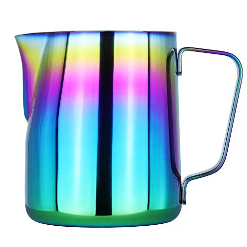 - STYLISH DESIGN - This is the most beautiful Frothing Pitcher on the market.With Sharp cup mouth for the stainless steel frothing pitcher,the milk or coffee will not stick on the cup when you froth or steam.The simple design and dripless spout means no mess and perfect latte art.The rainbow color also let it to be a good decoration in your kitchen.