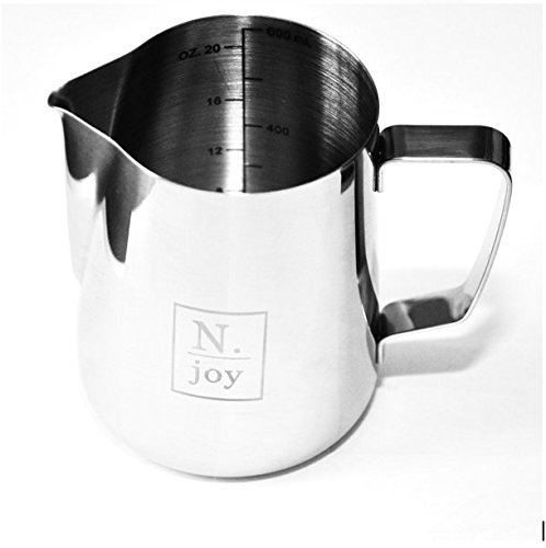 N.joy the Essentials Stainless Steel Milk Pitcher, Suitable for Coffee, Latte and Frothing Milk, Measurements Inside the Pitcher,Available in 20 Oz, hopefully can help you in buying the product.